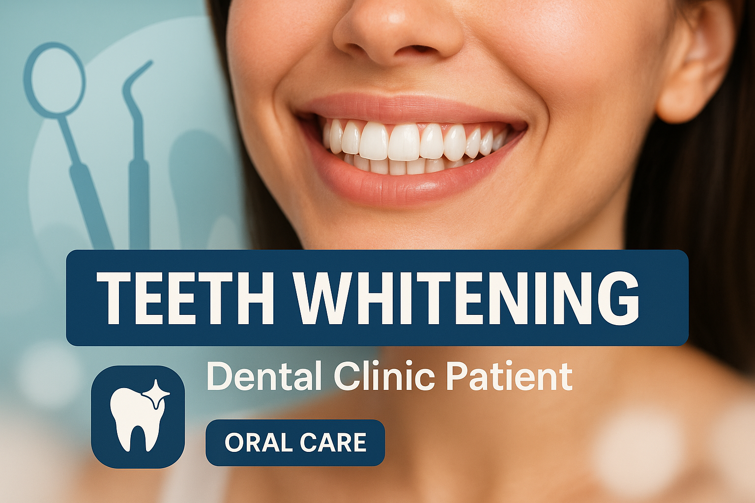 /Collection: /by davooda/Type: PNG/Engaging promotional image for a dental clinic focused on teeth whitening services. The design combines a smiling patient with dental imagery, suitable for marketing and educational materials.