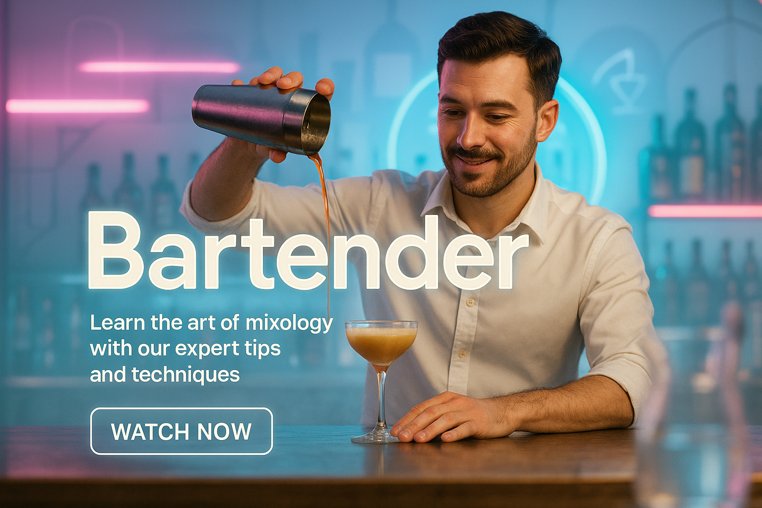 Dynamic promotional image for a bartending course featuring a smiling bartender mixing a cocktail. Ideal for social media or website advertising.