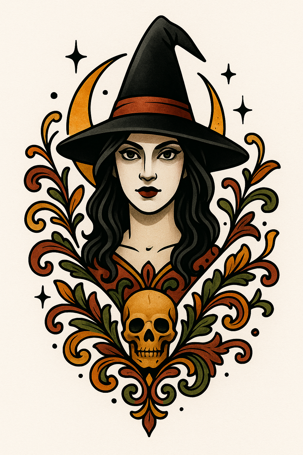 A detailed illustration of a witch featuring a stylized female figure, a skull, and ornate floral designs. Ideal for use in Halloween-themed graphics or merchandise.