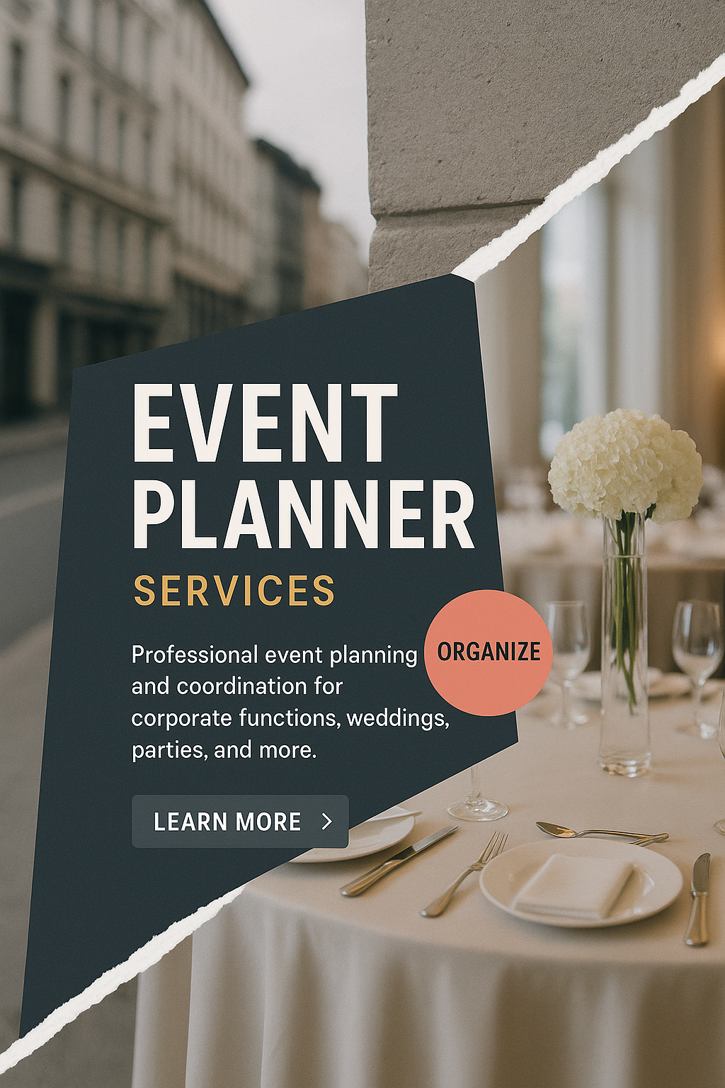 A visually engaging design for an event planning service, featuring a layered composition with a street background, elegant table setting, and clear text hierarchy.