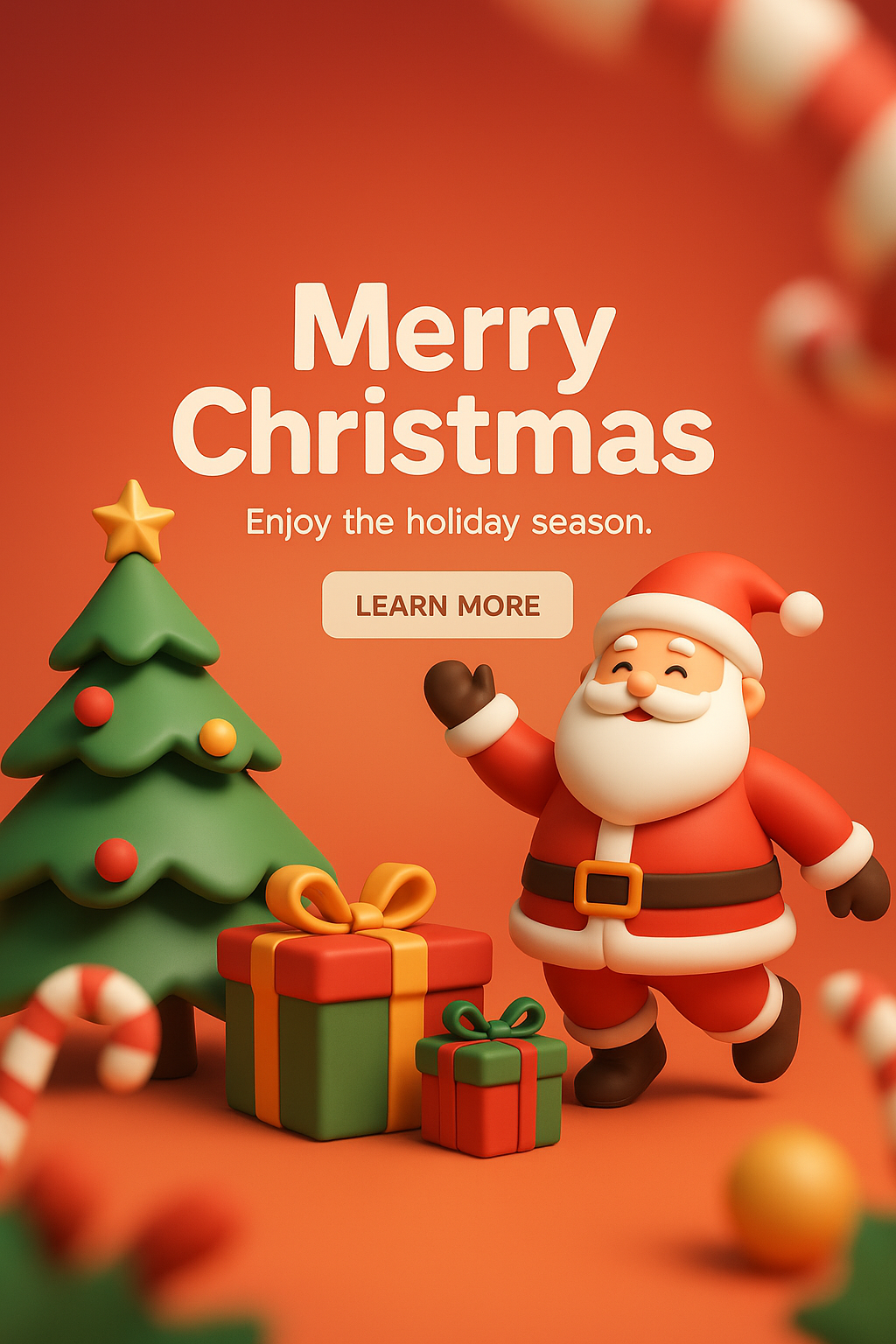 A festive 3D graphic featuring Santa Claus, a Christmas tree, and wrapped gifts, ideal for holiday promotions or greeting cards.