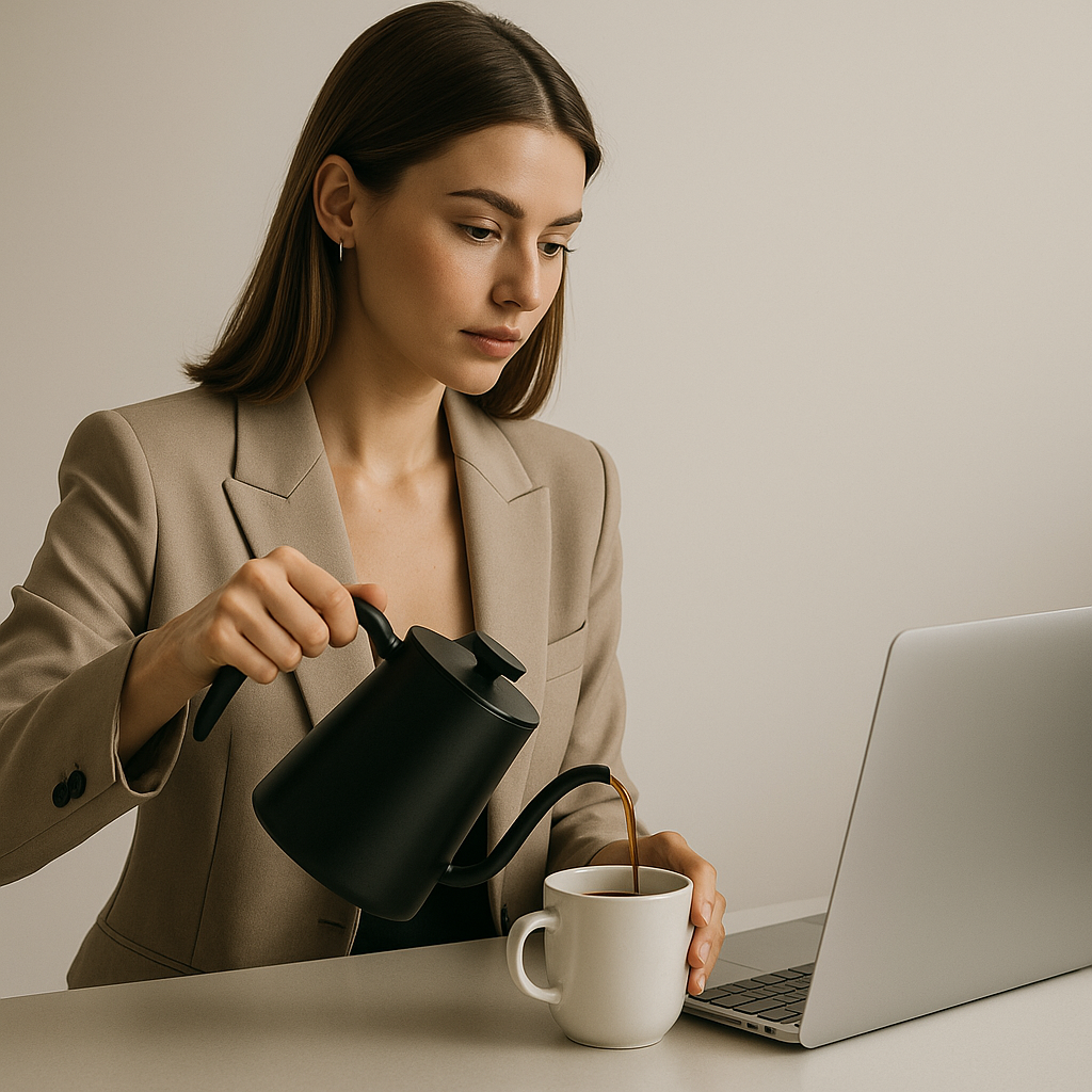 Stylish Woman Pouring Coffee While Using Laptop