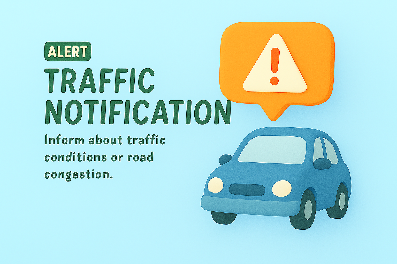Colorful 3D representation of a traffic notification featuring a car icon and alert bubble, suitable for use in transportation or navigation apps.