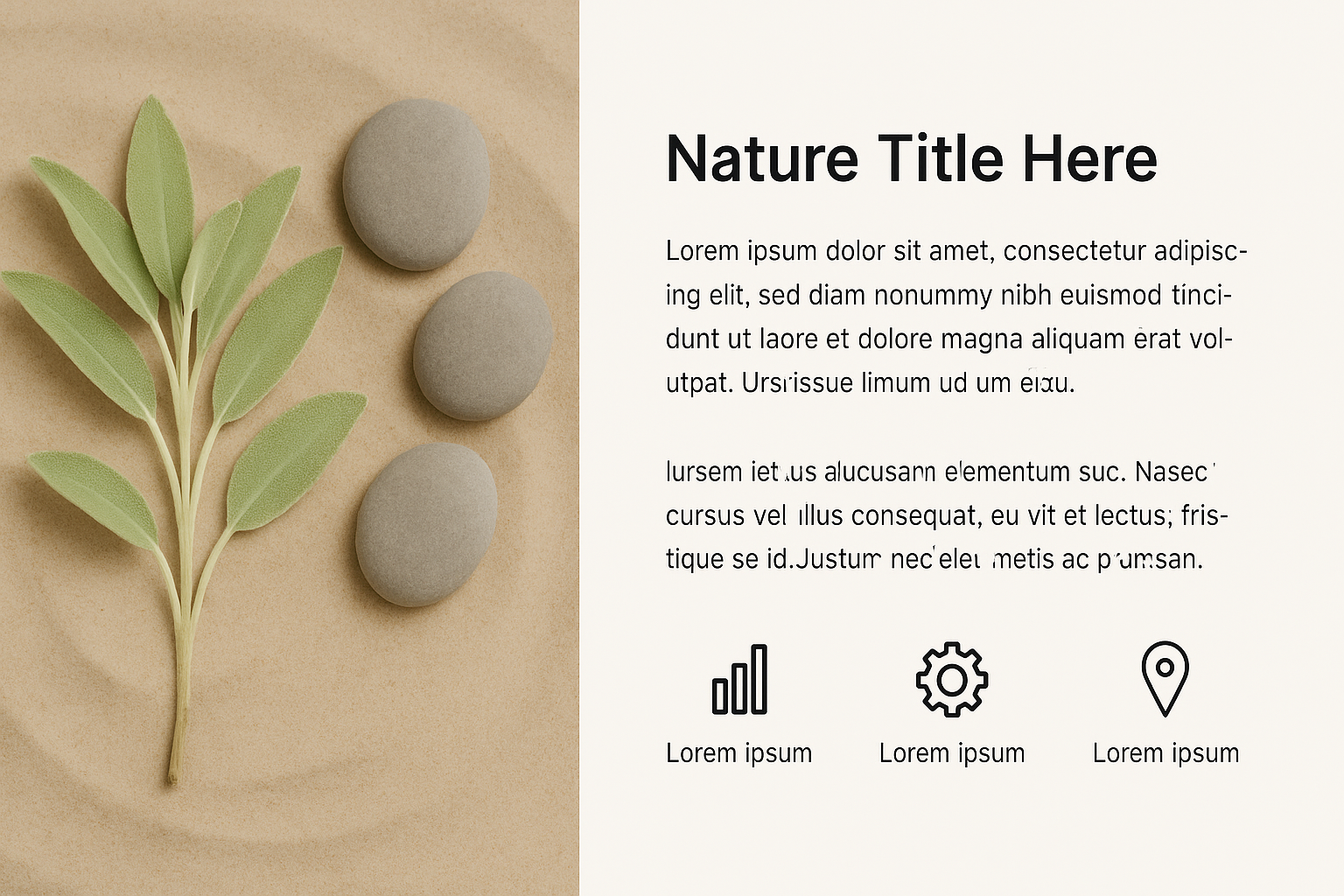 A serene design featuring stones and leaves on sand, suitable for wellness or environmental themes. The layout includes placeholder text for additional information.