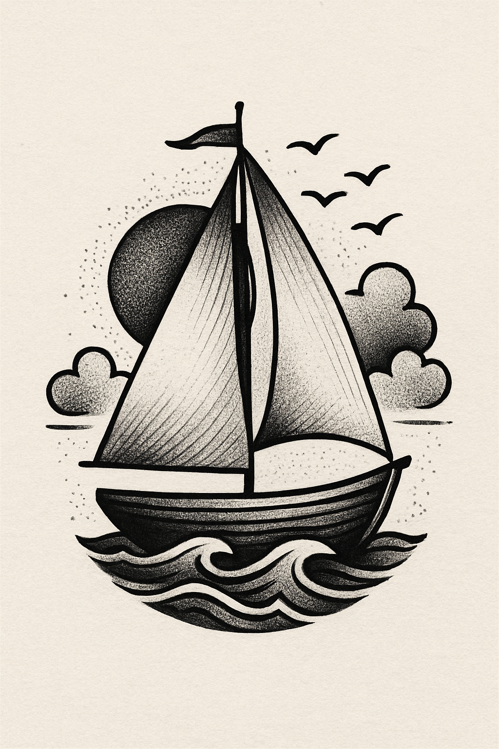 This is a monochromatic illustration of a sailboat on water, featuring stylized clouds and birds. Its vintage style makes it suitable for art prints or nautical-themed designs.