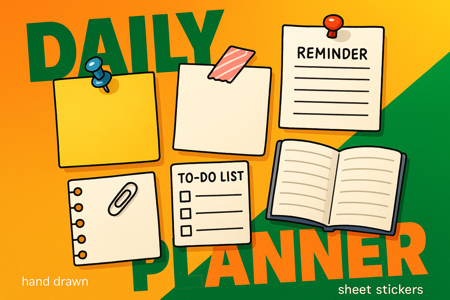 /Collection: /by davooda/Type: PNG/A collection of colorful, hand-drawn planner doodles featuring sticky notes, reminders, and to-do lists. The vibrant background enhances the playful yet minimalistic layout.