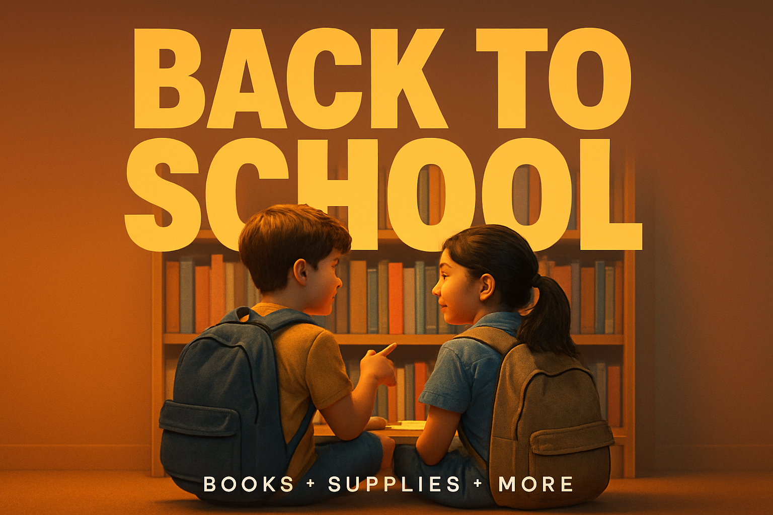 /Collection: /by davooda/Type: PNG/Two children sit in a bookstore, engaged in conversation about books surrounded by shelves filled with literature. The scene features a bold headline and a modern aesthetic.
