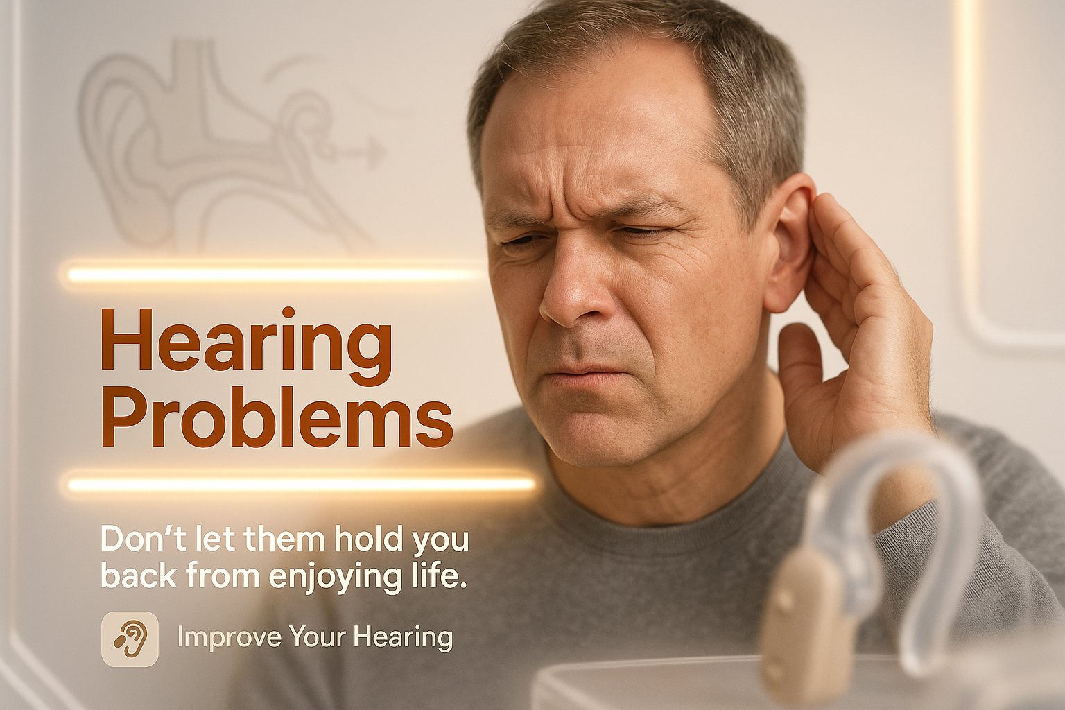 Engaging health awareness graphic focusing on hearing issues, featuring a concerned individual. Ideal for promoting hearing health initiatives and support.
