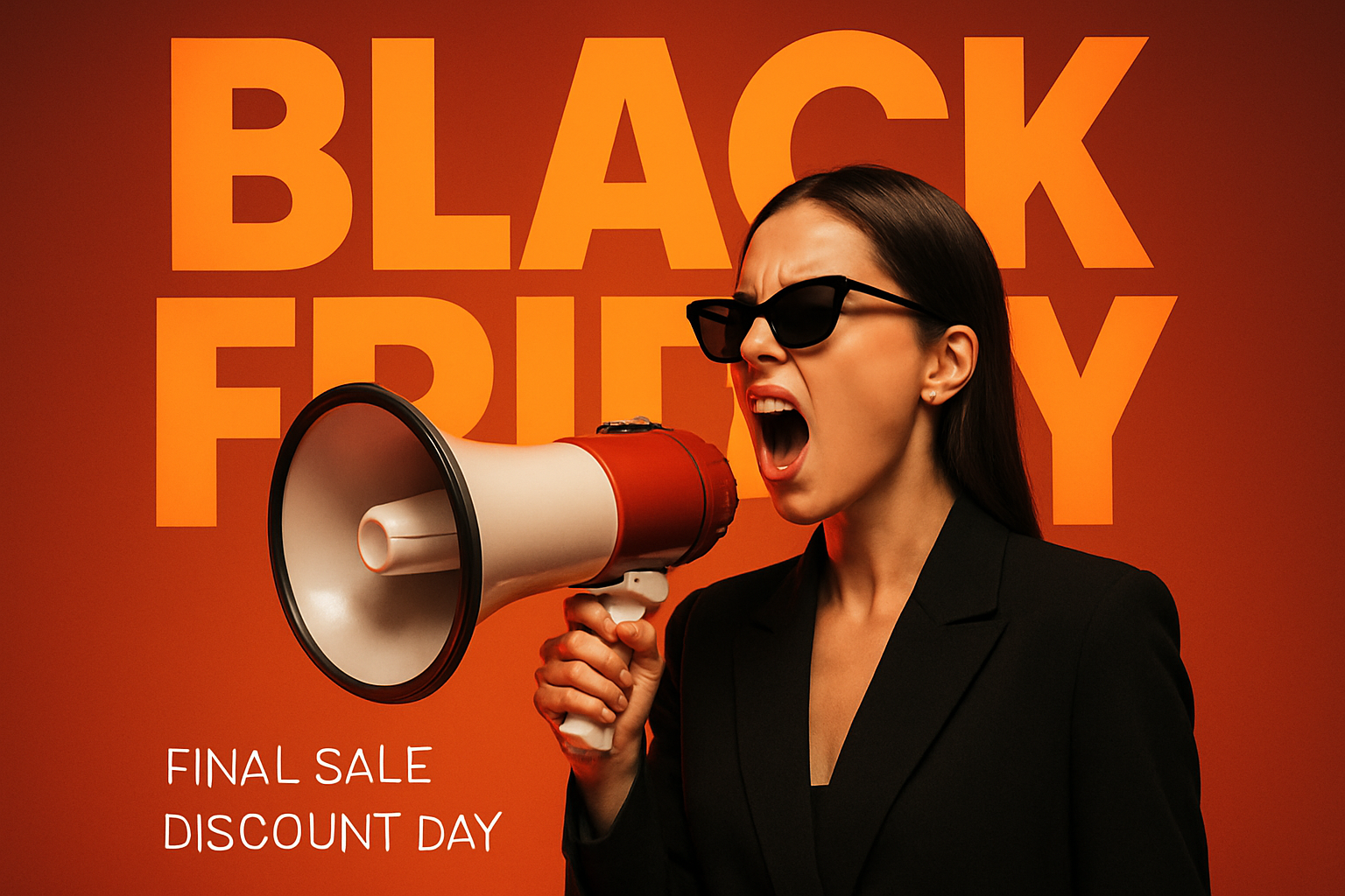/Collection: /by davooda/Type: PNG/A stylish brunette woman passionately announces Black Friday sales using a loudspeaker. The modern design features bold typography and a warm gradient background, creating a striking visual impact.