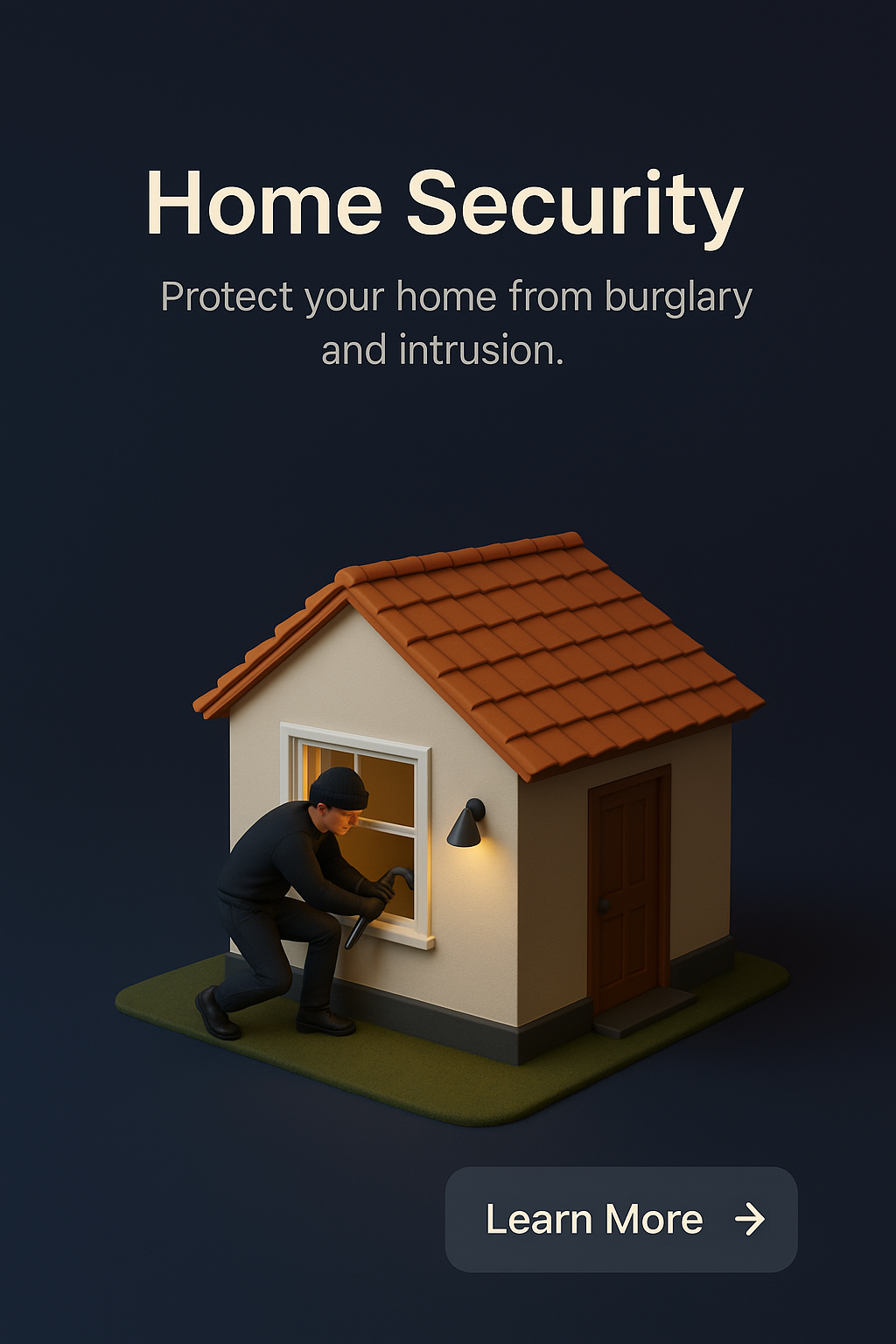 A realistic 3D scene depicting an intruder attempting to break into a house. The background features a smooth dark gradient, enhancing the focus on the security theme.