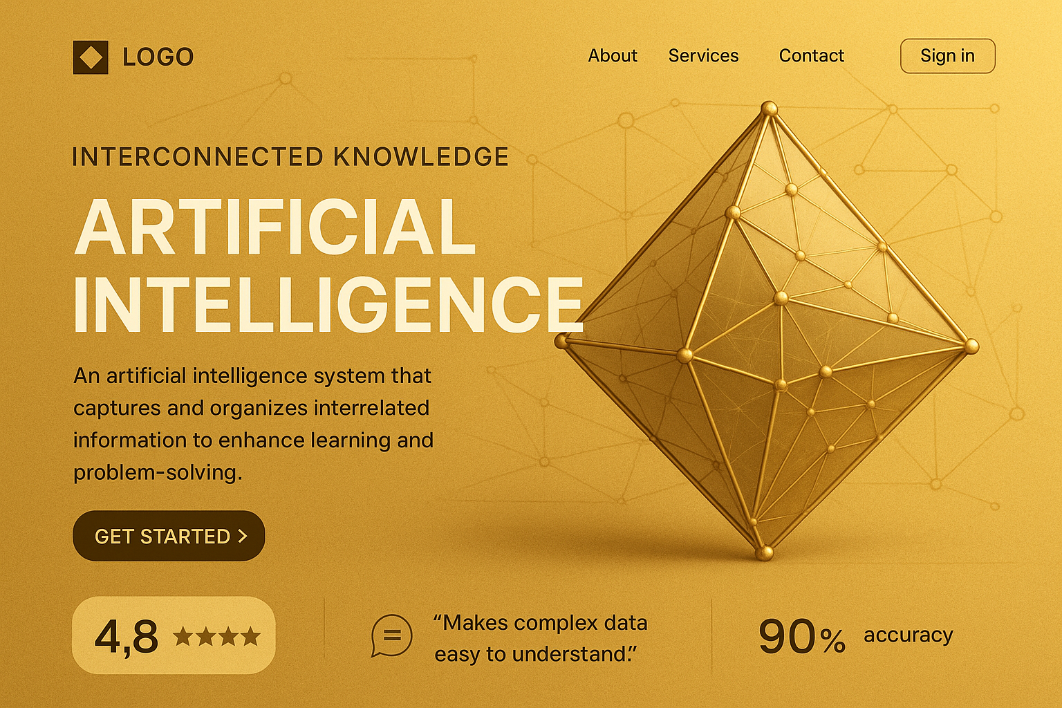 /Collection: /by davooda/Type: PNG/A visually striking landing page design with a golden background, featuring geometric shapes and bold typography focused on artificial intelligence. Includes action buttons and a clear layout.