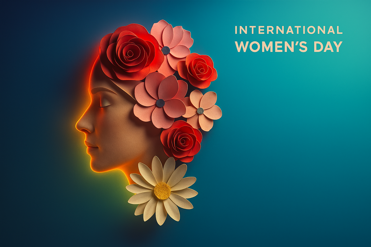 /Collection: /by davooda/Type: PNG/A beautifully crafted illustration featuring a realistic face adorned with vibrant paper-cut flowers. The design highlights International Women's Day with a smooth gradient background, enhancing the overall aesthetic.