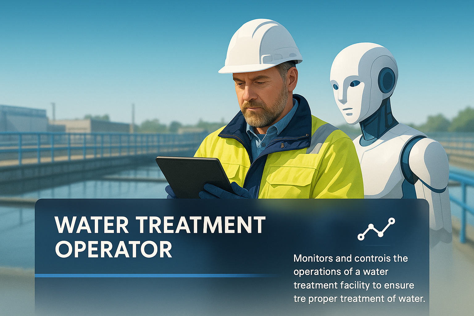 /Collection: /by davooda/Type: PNG/An image depicting a water treatment operator using a tablet, with an AI assistant beside him. The background features a water treatment facility, showcasing a professional working environment.