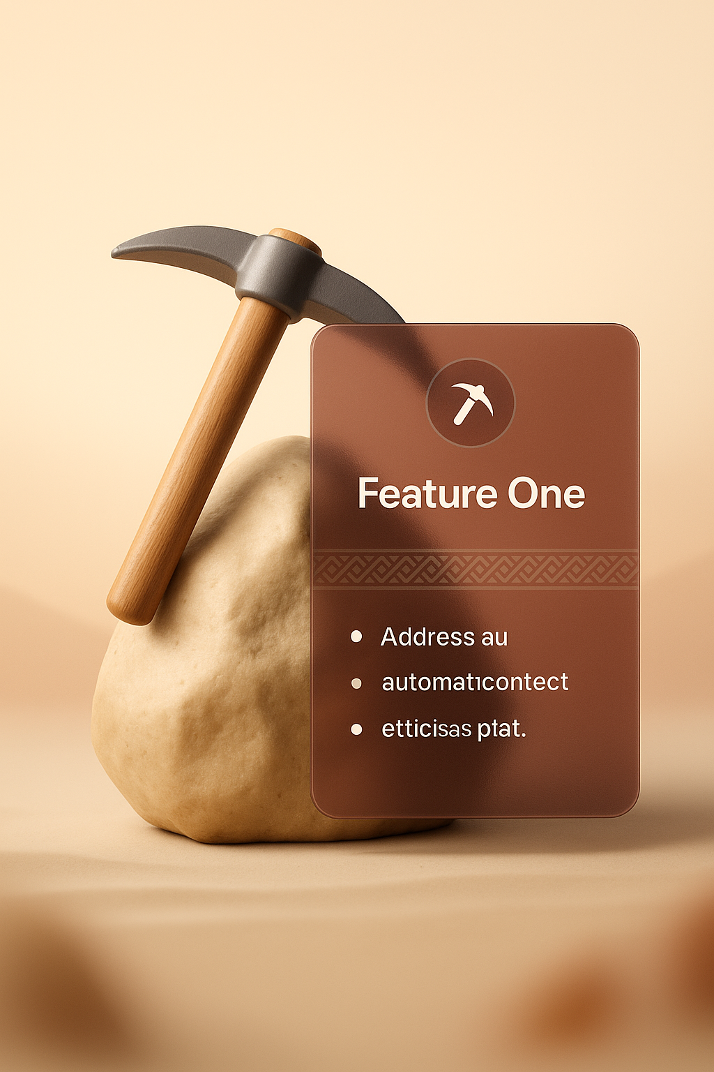 /Collection: /by davooda/Type: PNG/A 3D illustration featuring a mining pickaxe resting on a textured rock. A stylized info card is integrated into the design, displaying key features and a cohesive color scheme.