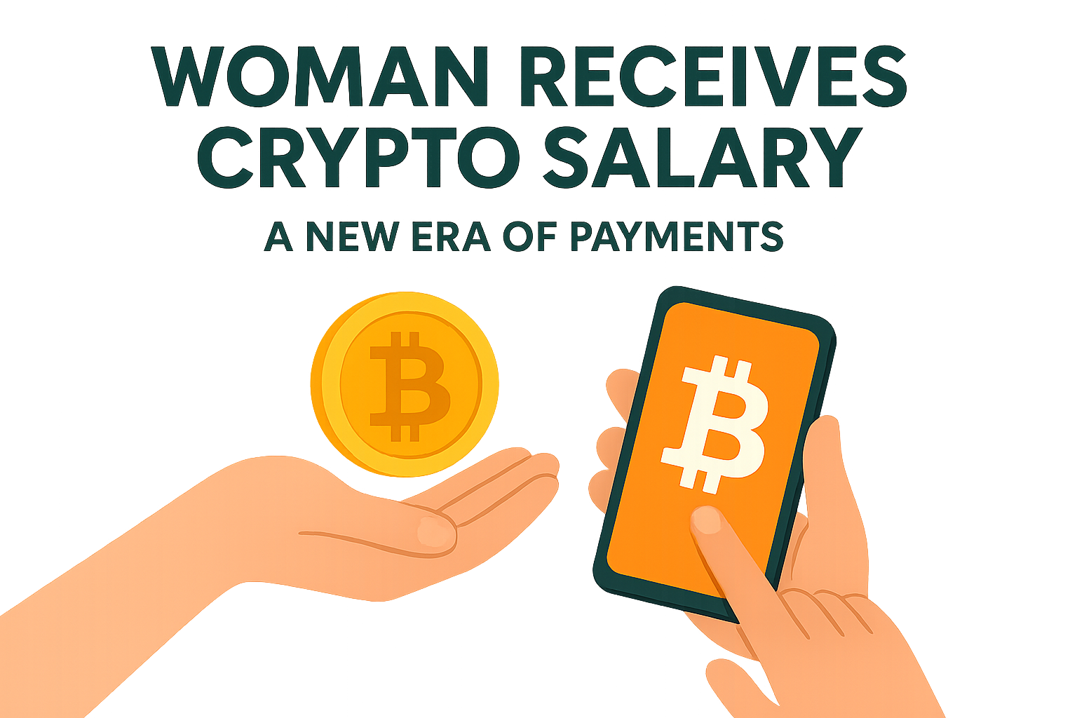 /Collection: /by davooda/Type: PNG/An engaging graphic illustrating the concept of receiving a salary in cryptocurrency, featuring a woman holding a Bitcoin and a smartphone. Ideal for educational or financial content.