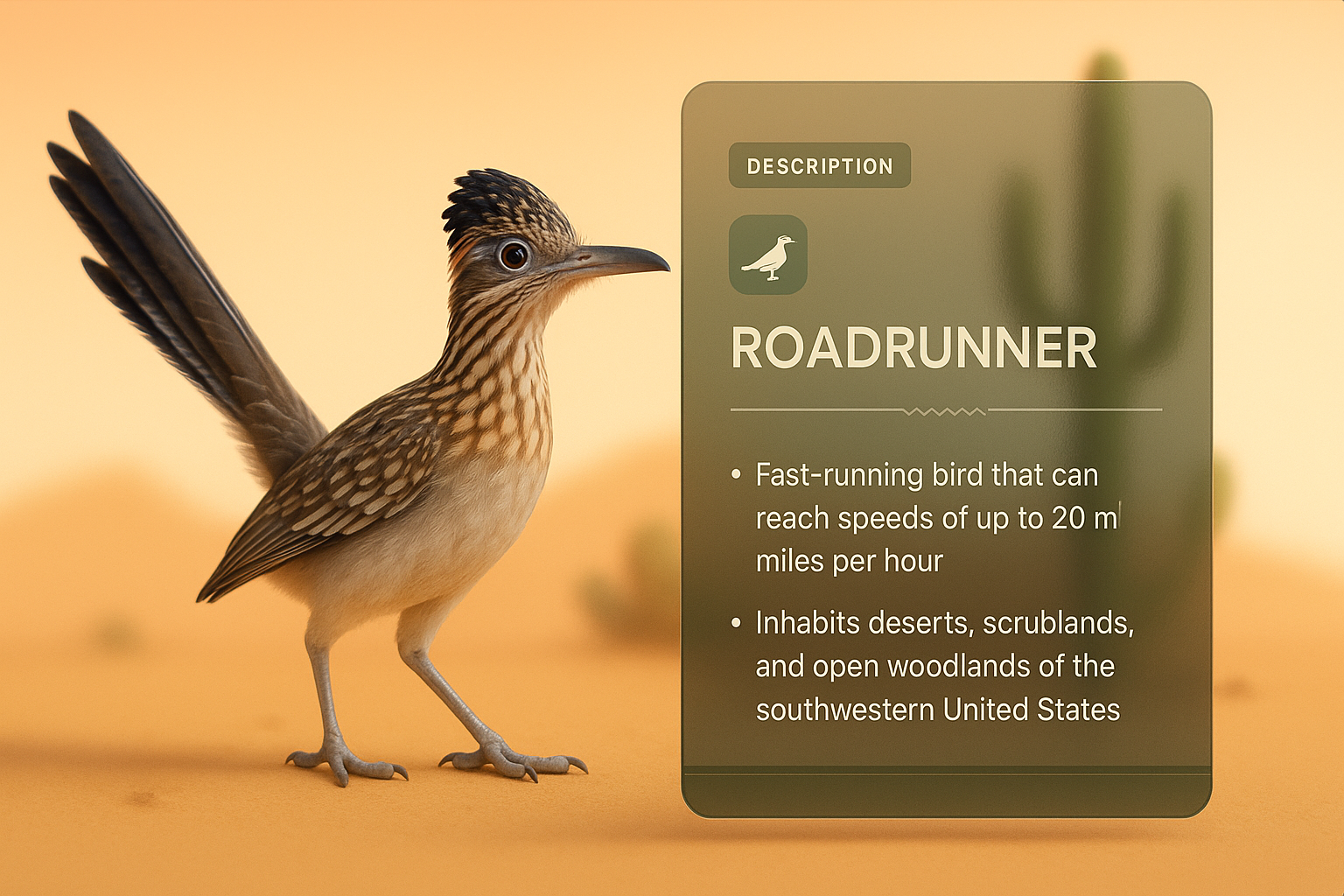 /Collection: /by davooda/Type: PNG/A detailed 3D illustration of a roadrunner bird set against a smooth gradient background. The design features integrated text blocks with clear descriptions and a modern aesthetic.