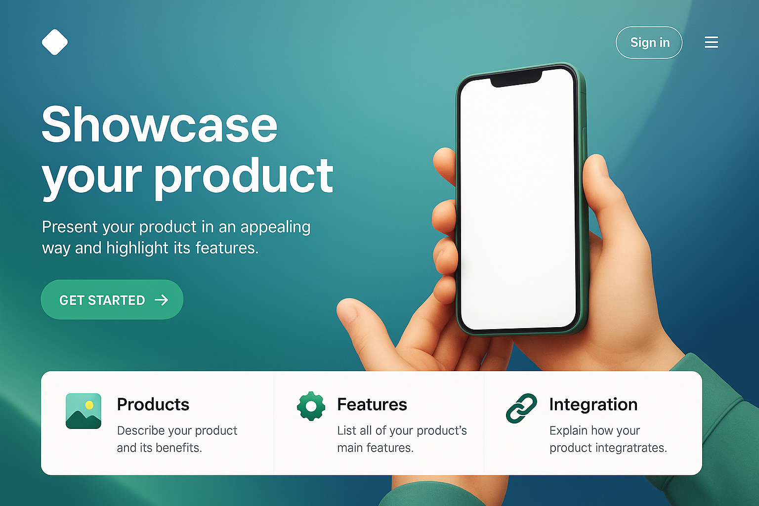 /Collection: /by davooda/Type: PNG/A visually appealing landing page featuring a green phone held in hands. The design includes a simple gradient background, a clear call to action, and sections for product features.
