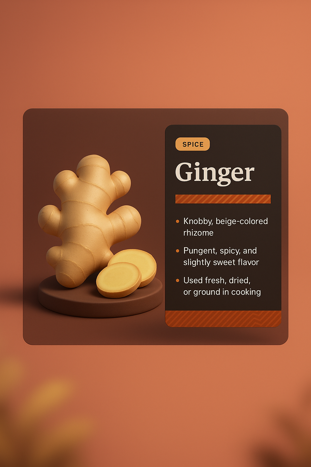 /Collection: /by davooda/Type: PNG/A stylized 3D ginger root on a gradient background, accompanied by a dark information panel detailing its culinary uses and characteristics. The design features a cohesive color scheme and layered elements for depth.