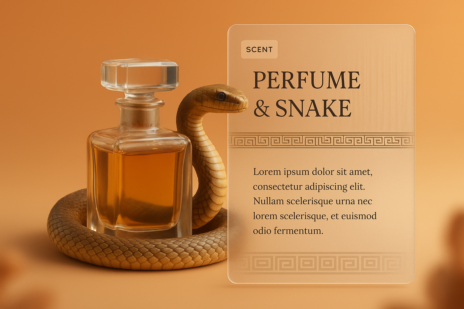 /Collection: /by davooda/Type: PNG/A luxurious perfume bottle sits beside a snake, creating a striking visual. The background features a smooth gradient, enhancing the elegant aesthetic of the scene.