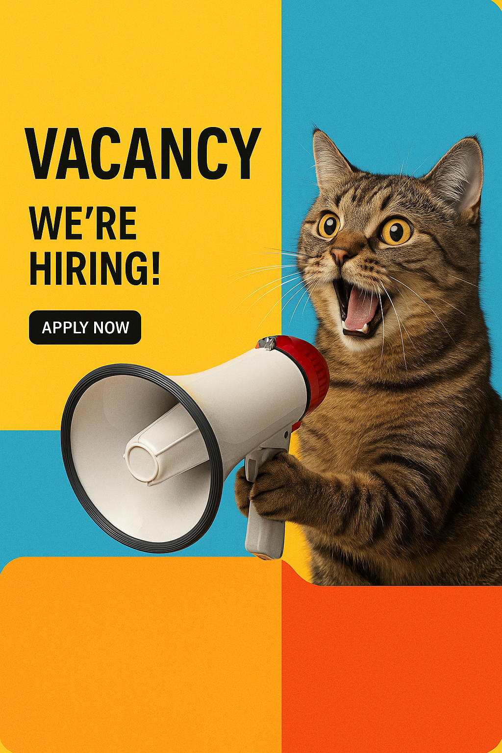 A lively cat holding a megaphone, promoting a job vacancy. The image features bold typography and a bright, geometric background, creating a modern and professional look.