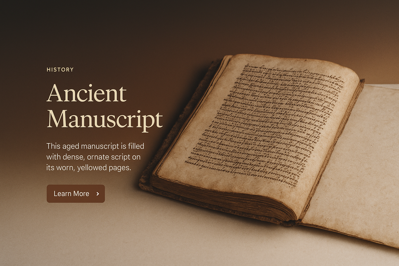 An aged manuscript with ornate script on worn, yellowed pages, featured prominently in a stylish web design layout. The background transitions from dark to light, enhancing readability.