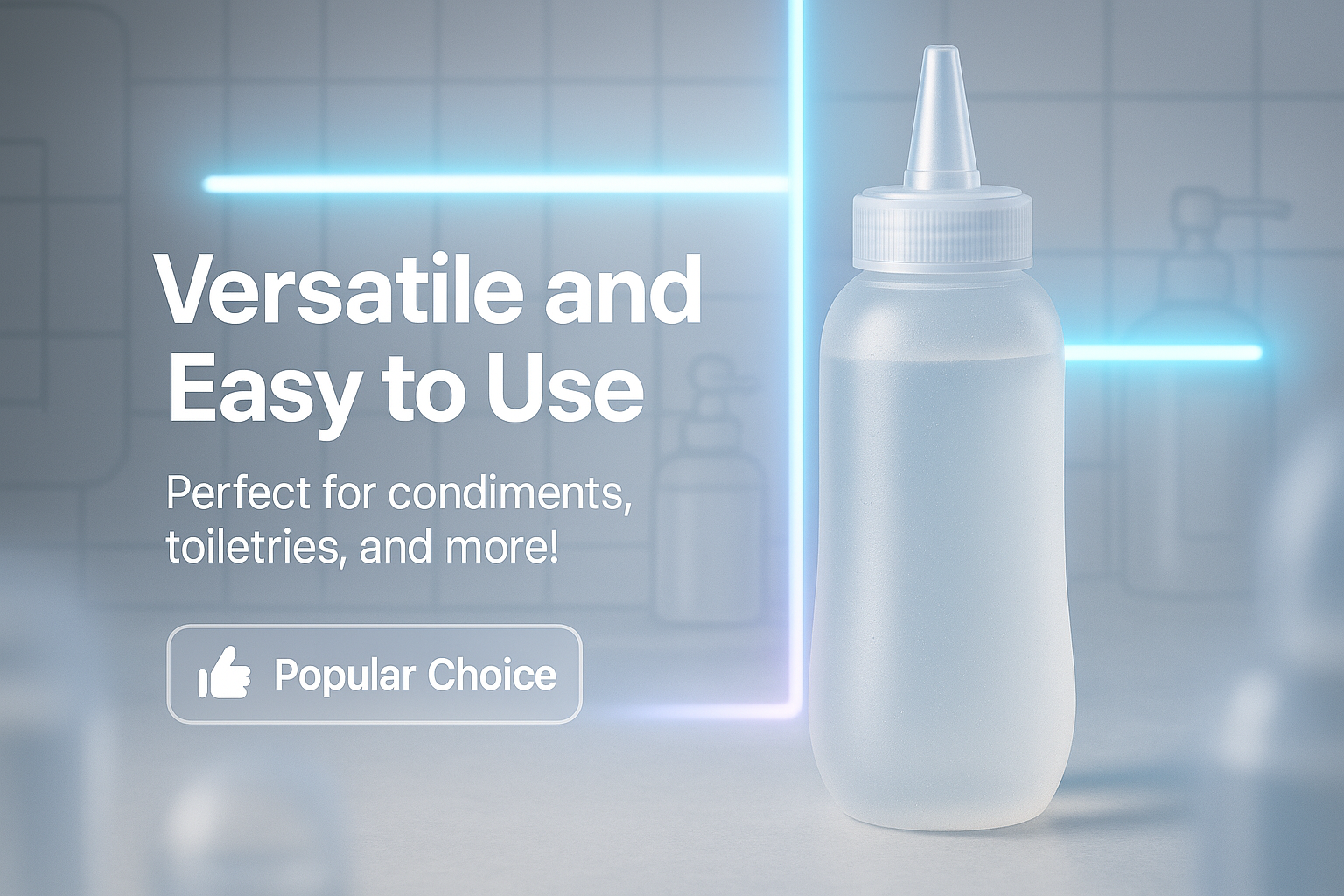 Modern product display featuring a squeeze bottle, ideal for showcasing versatility in use for condiments and toiletries. Clean design with soft lighting and minimalistic background.
