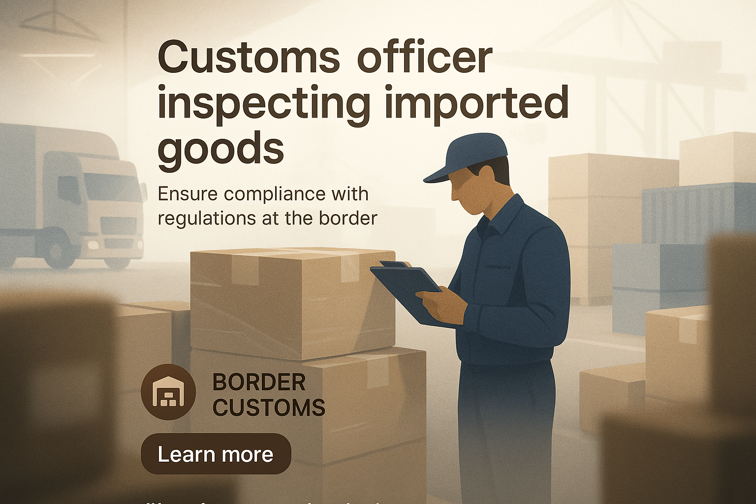 /Collection: /by davooda/Type: PNG/Illustrative graphic depicting a customs officer inspecting imported goods, emphasizing regulatory compliance. Ideal for educational or informational contexts related to import regulations.