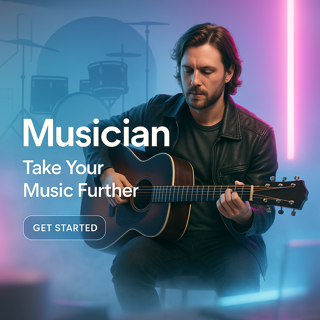 /Collection: /by davooda/Type: PNG/This promotional graphic targets musicians, featuring a seated male guitarist in a modern setting. The design combines vibrant lighting with a clear call to action, ideal for social media or website use.