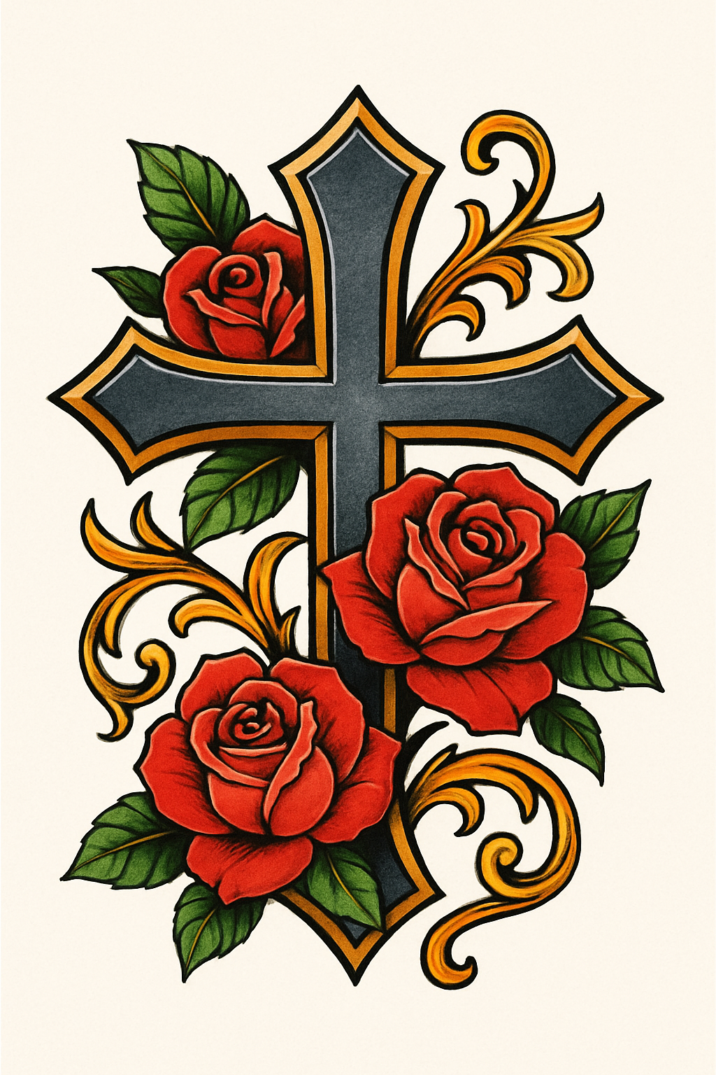 Vibrant tattoo design showcasing a bold cross adorned with red roses and intricate floral elements, ideal for tattoo enthusiasts and artists.