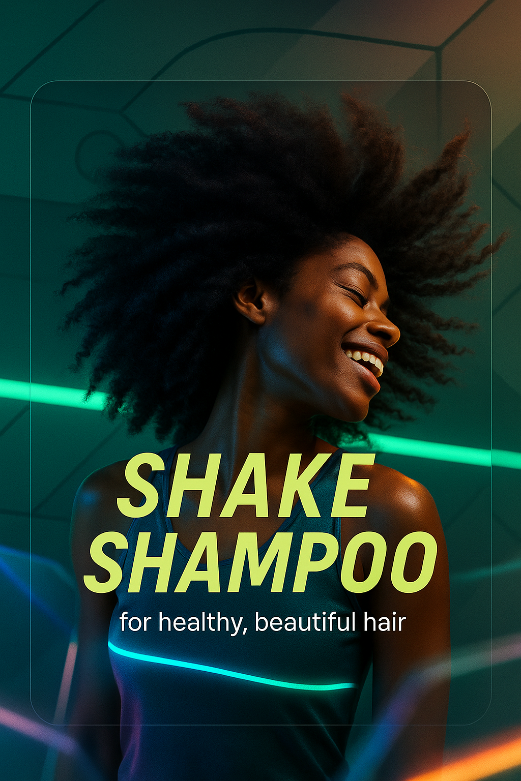 /Collection: /by davooda/Type: PNG/Dynamic promotional image for hair care product featuring a cheerful woman with voluminous hair, enhanced by vibrant lighting elements. Ideal for beauty and wellness marketing.