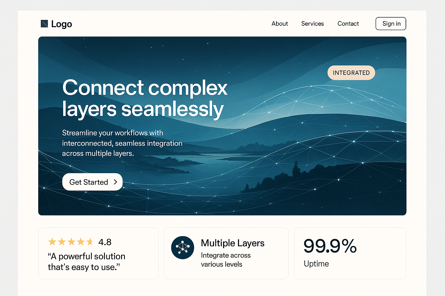 /Collection: /by davooda/Type: PNG/A modern landing page design featuring concentric layers with a deep, realistic landscape. Includes a logo, tagline, action buttons, and performance metrics.