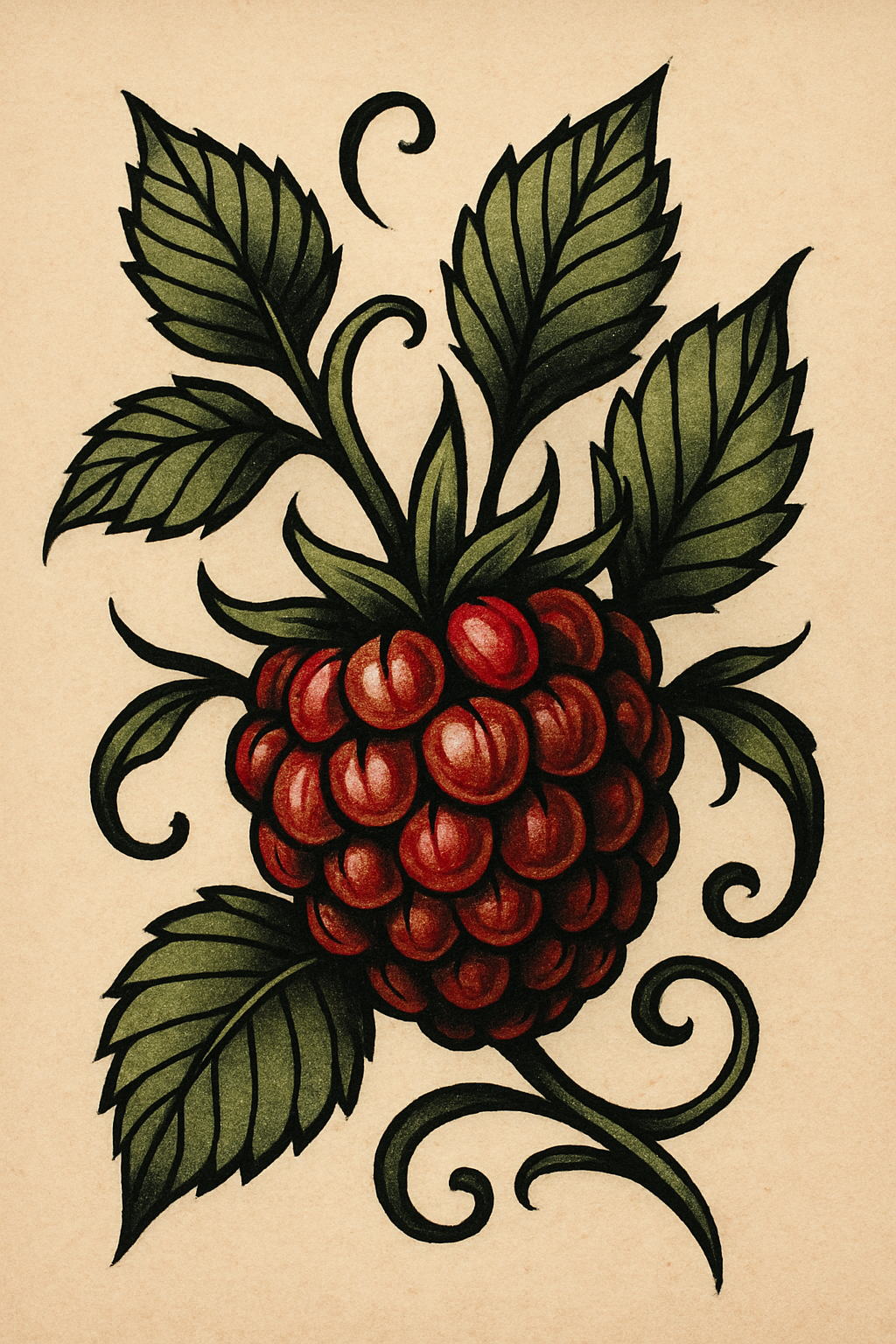 /Collection: /by davooda/Type: PNG/This is a vintage-style graphic illustration of a raspberry surrounded by leaves. It features bold colors and intricate detailing, suitable for use in culinary or botanical contexts.