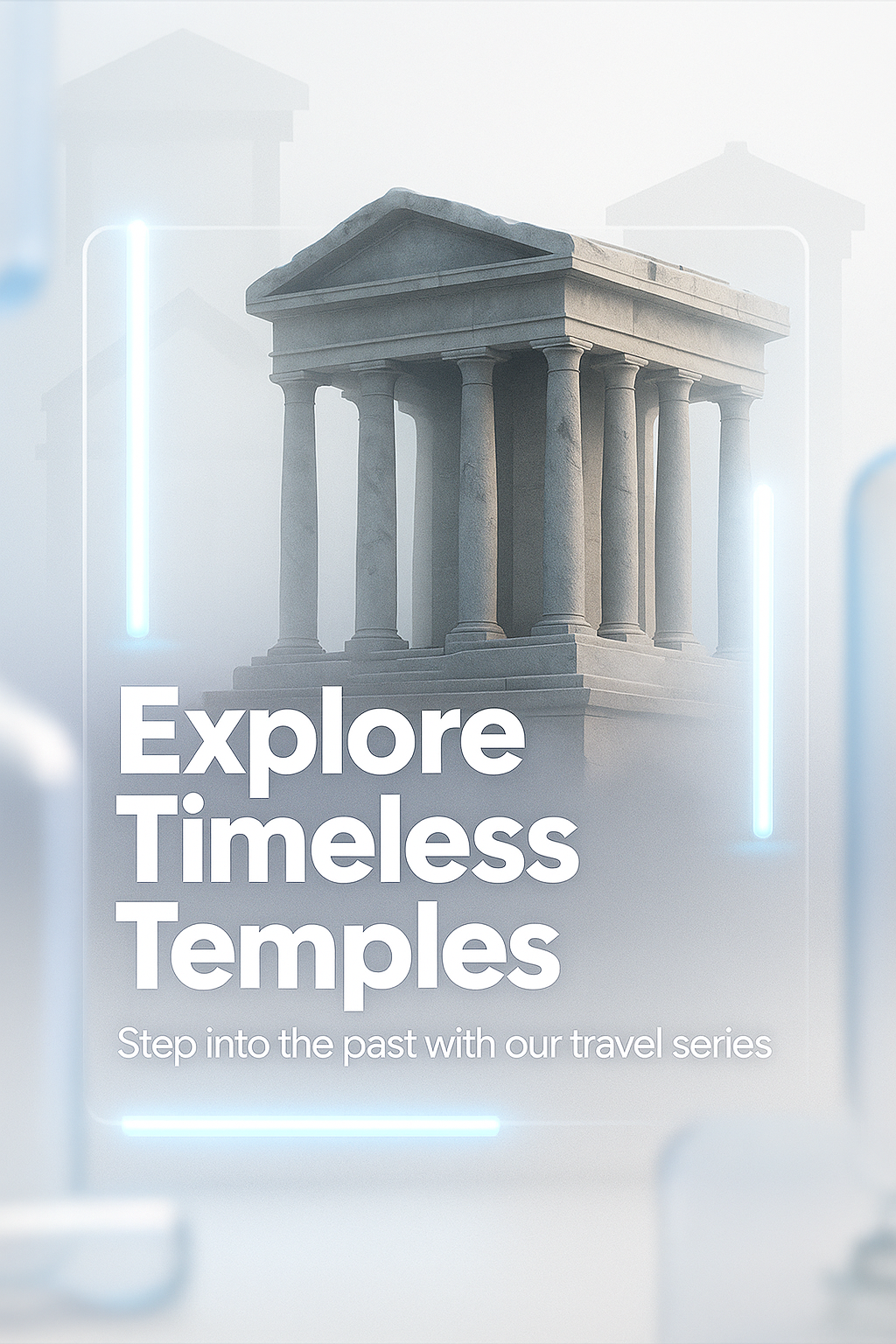 /Collection: /by davooda/Type: PNG/A bright, layered carousel slide featuring a realistic temple with neon accents. The design incorporates text elements that invite viewers to explore timeless temples in a travel series.