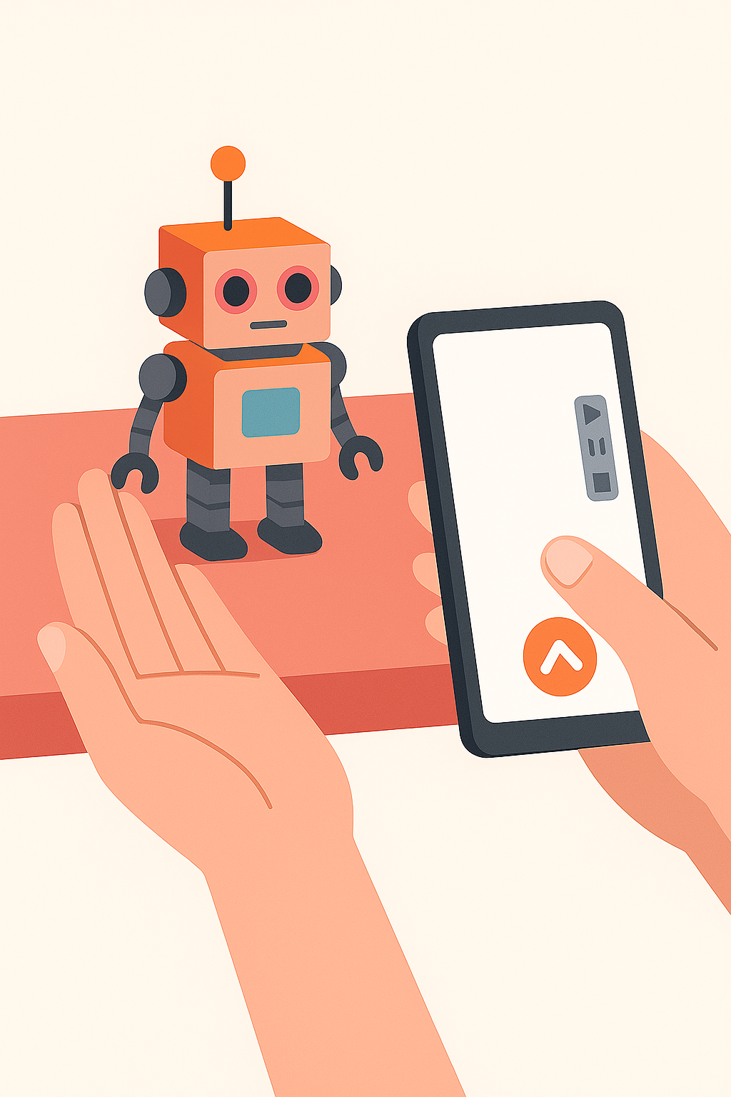 /Collection: /by davooda/Type: PNG/Playful vector illustration depicting a hand holding a smartphone controlling a small robot toy. Ideal for technology or parenting themes in digital media.