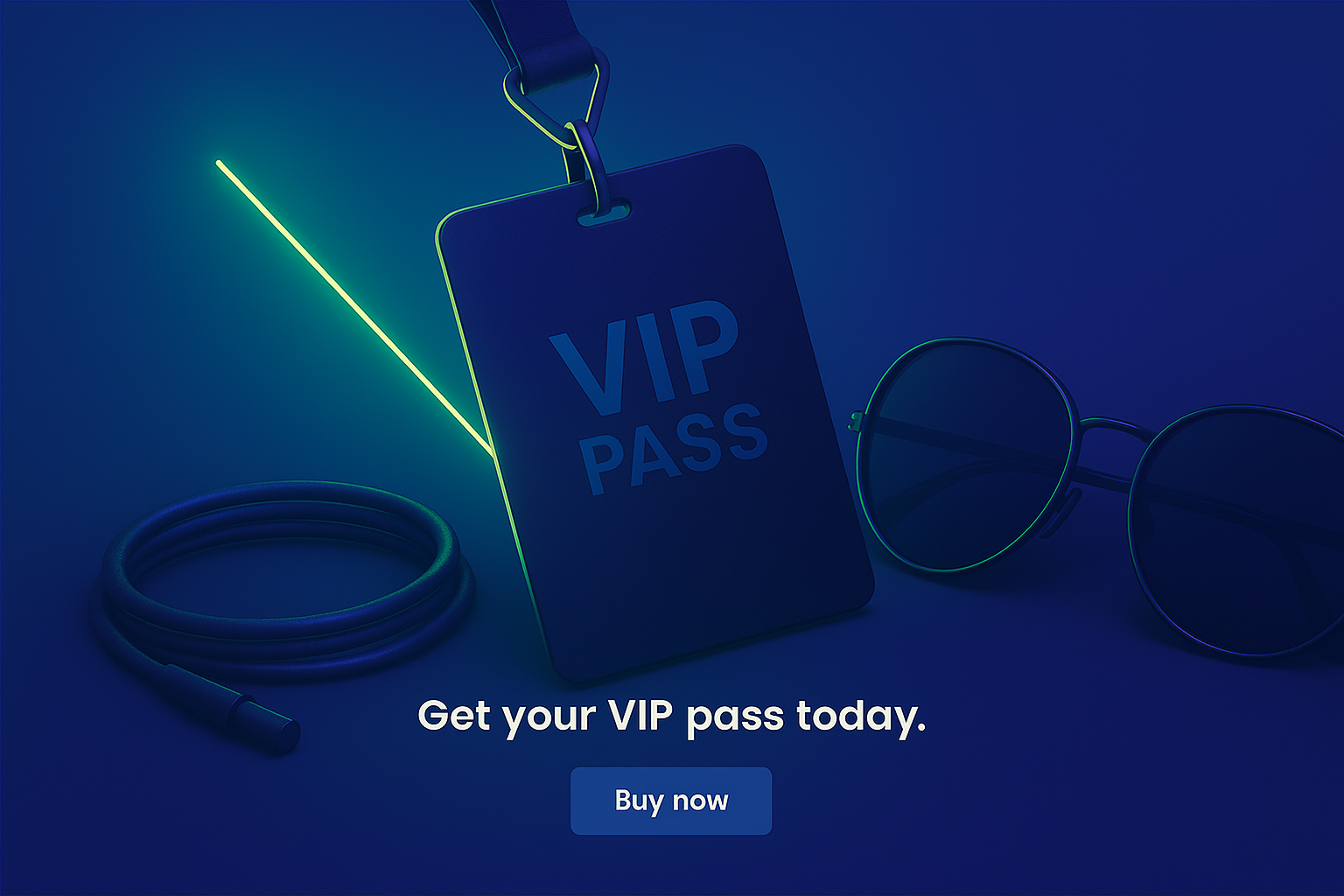 A visually striking composition featuring a VIP pass, sunglasses, and neon accents. The scene is set in shadow, with glowing lines enhancing the atmosphere and vibrant colors.