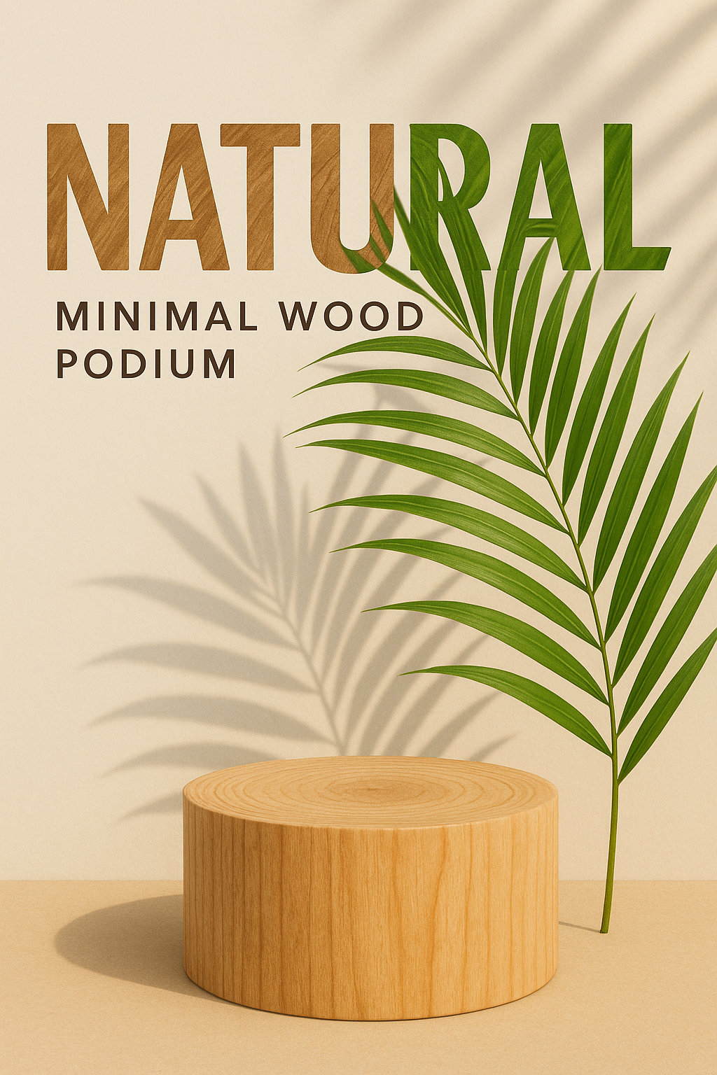 Minimal Natural Wood Podium with Palm Leaf in Sunlight