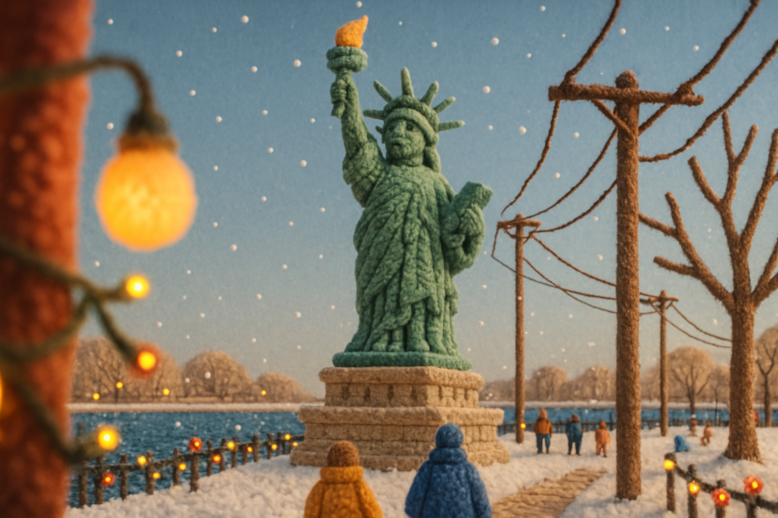 Whimsical Winter Scene of the Statue of Liberty in Yarn Art
