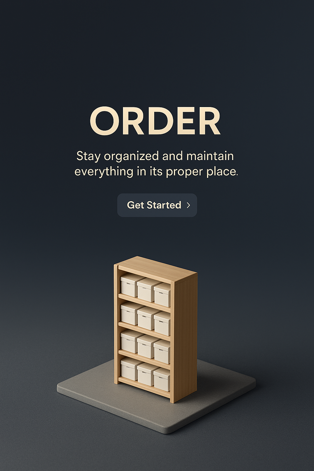 A visually striking 3D scene depicting a minimalist wooden storage unit with labeled boxes, emphasizing order and organization against a dark gradient background.