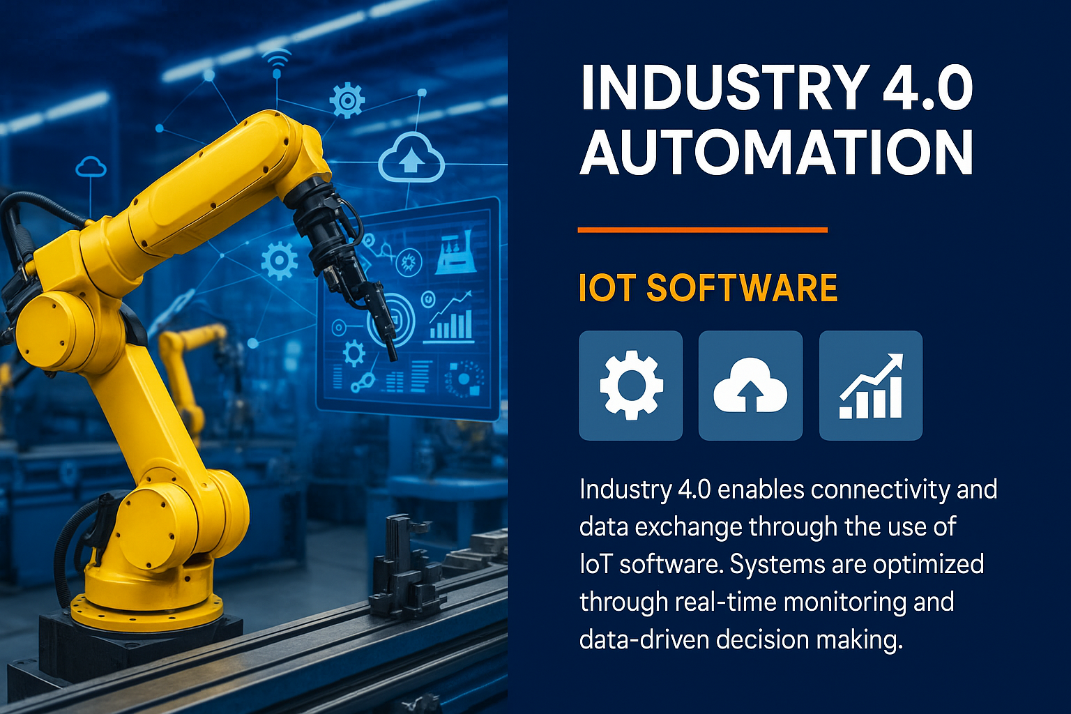 Informative graphic illustrating Industry 4.0 automation featuring a robotic arm and IoT software elements. Ideal for tech presentations or marketing materials.