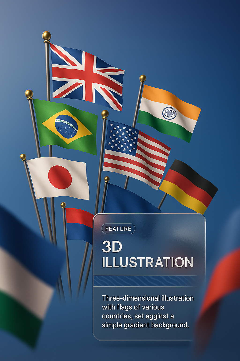 /Collection: /by davooda/Type: PNG/A 3D illustration showcasing the flags of various countries, including the UK, Brazil, India, and others. The flags are placed against a smooth gradient background, enhancing visual appeal.