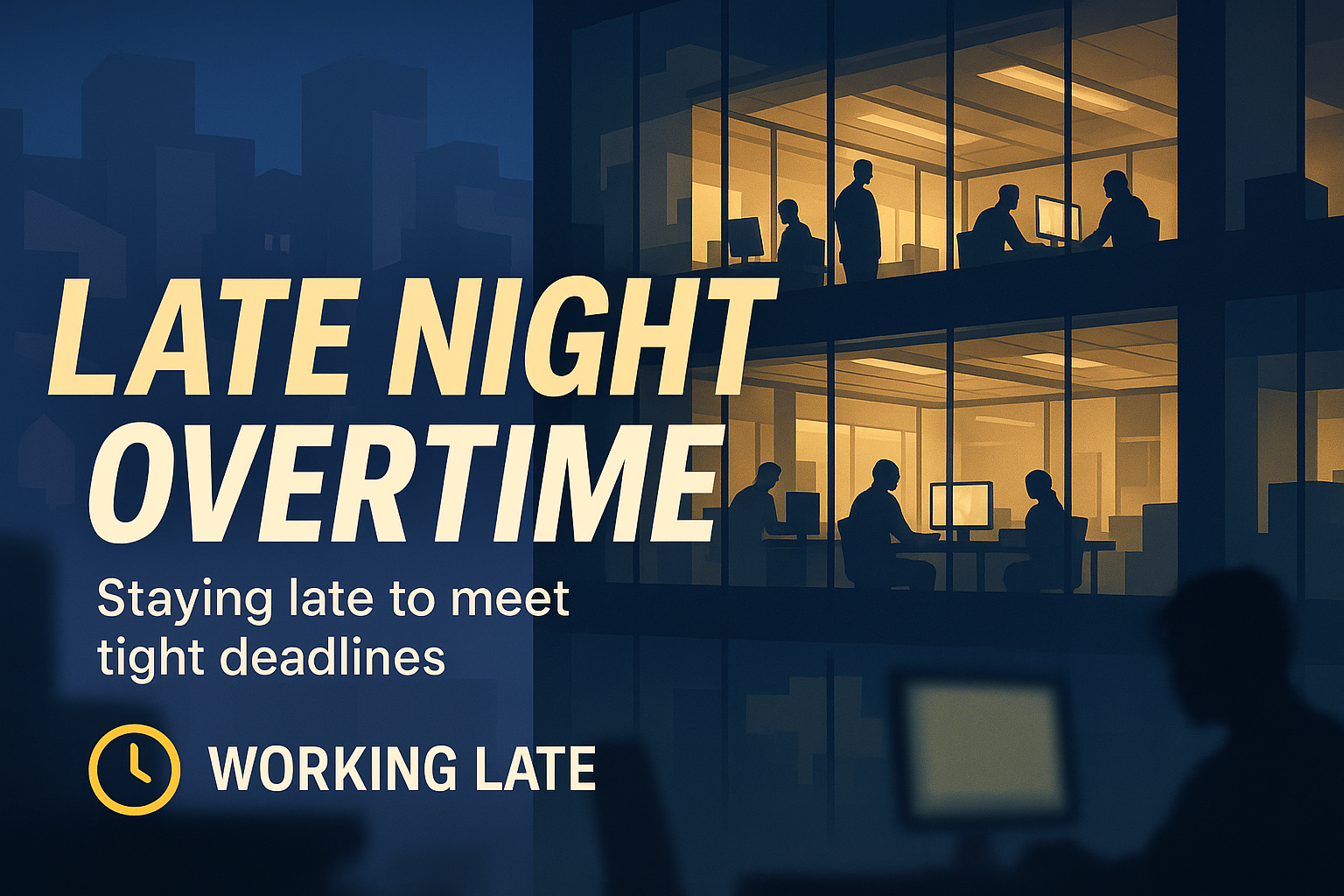 /Collection: /by davooda/Type: PNG/A visually engaging graphic illustrating the theme of late-night work. Featuring silhouettes of individuals in an office setting, it conveys the concept of dedication and overtime for meeting deadlines.
