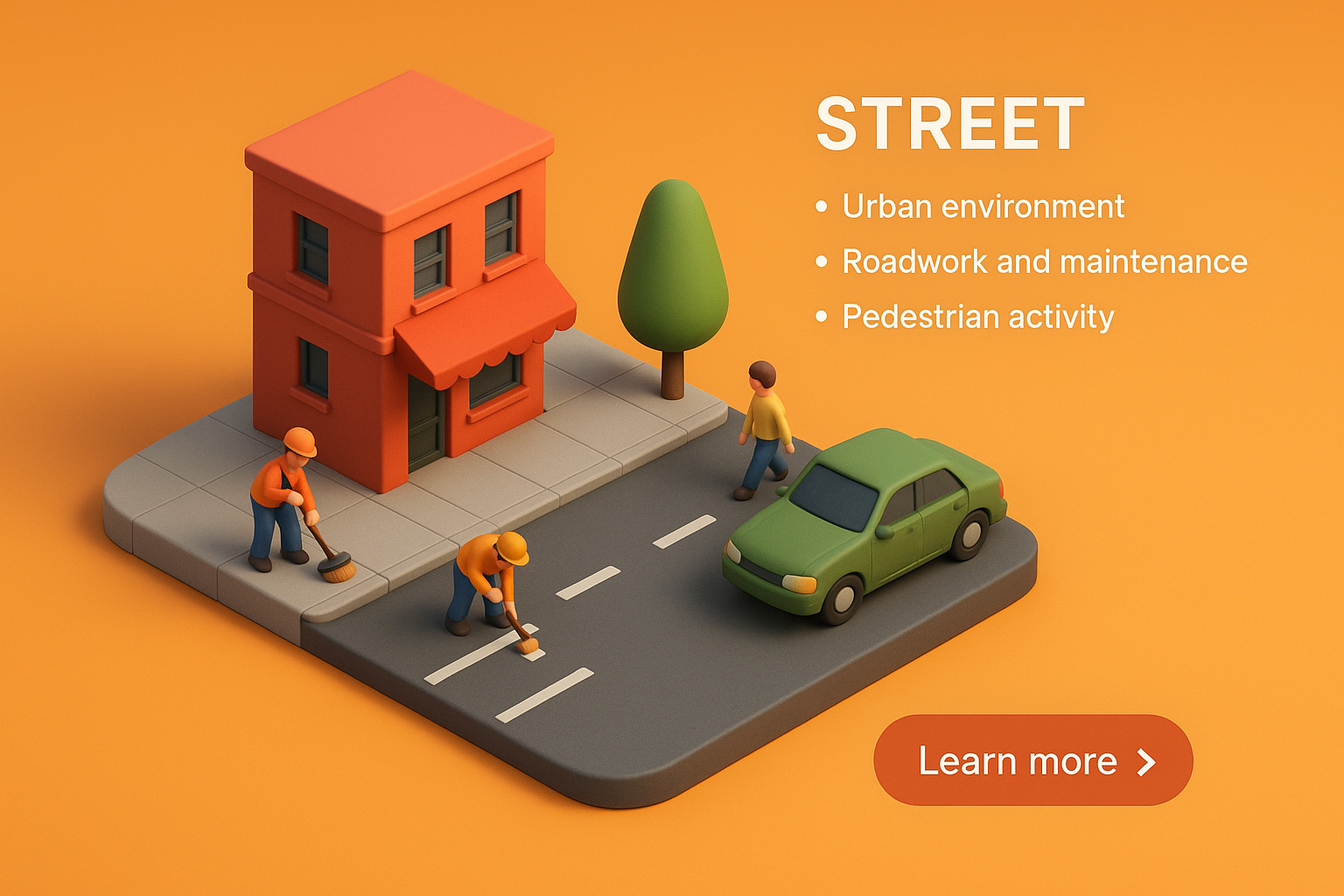 A vibrant 3D representation of a small urban street scene featuring pedestrians engaged in activities, with a bright orange background and a stylized car.