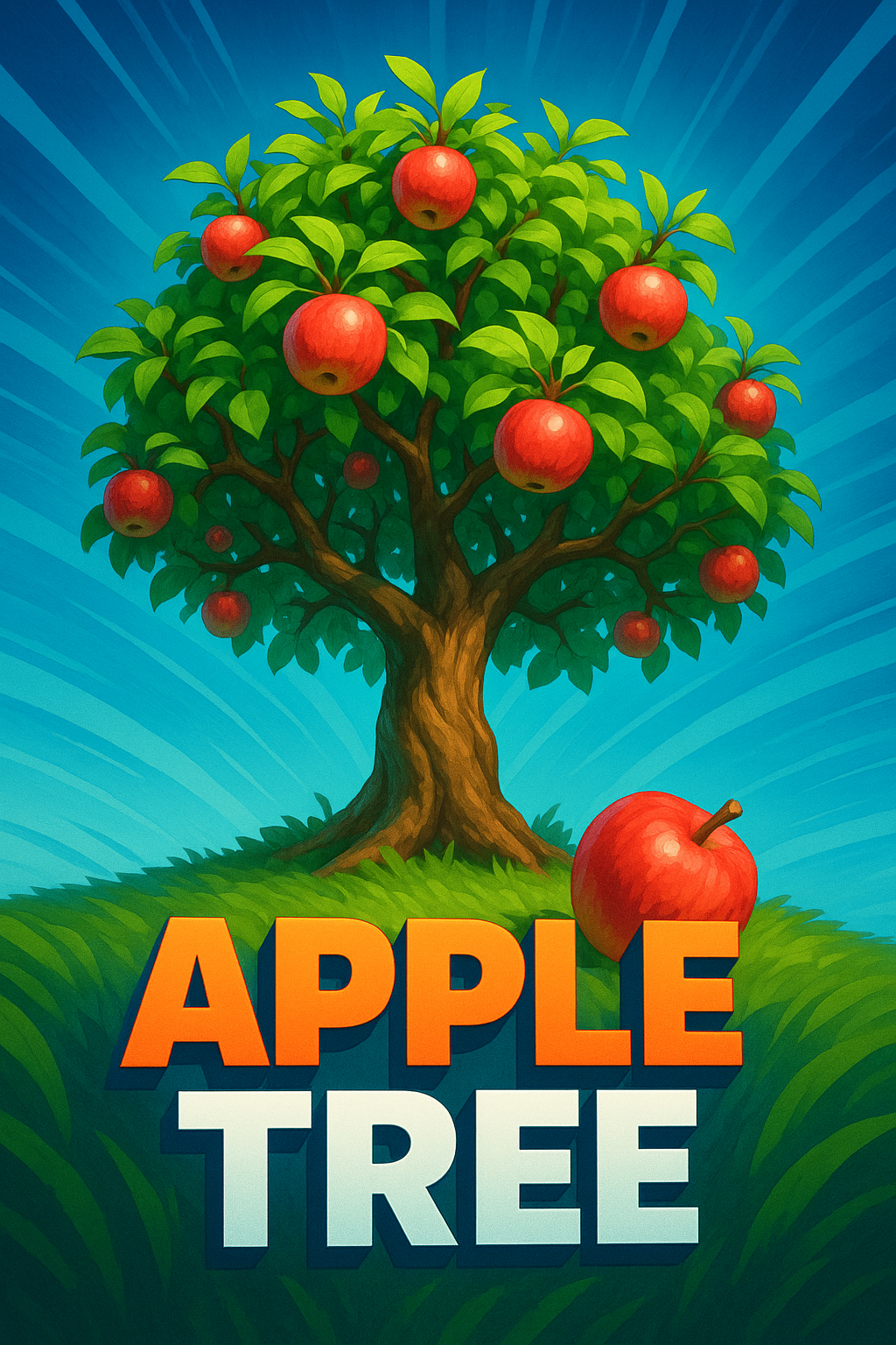 /Collection: /by davooda/Type: PNG/A vibrant illustration of an apple tree, featuring bright red apples against a rich blue gradient background. The title 'APPLE TREE' stands out in bold, engaging typography, enhancing the dynamic composition.
