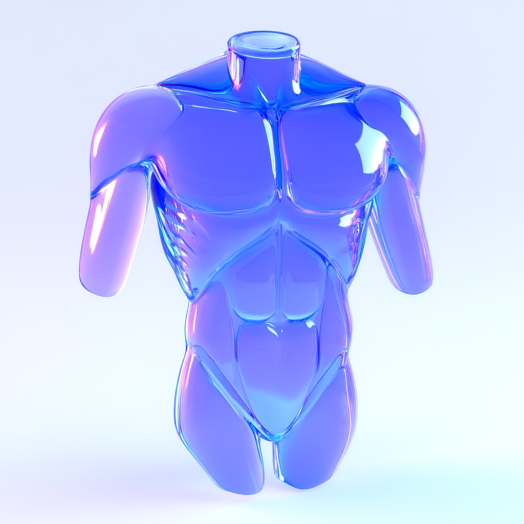 A vibrant 3D rendered model of a male torso, showcasing a glossy, translucent design. Ideal for use in artistic, educational, or promotional contexts.