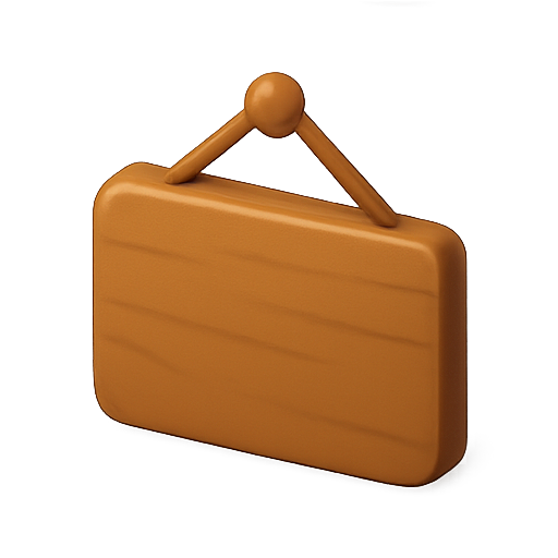 A stylized 3D icon of a wooden sign with a loop for hanging. The design features smooth, rounded edges and a warm brown color, making it suitable for various digital applications and branding.
