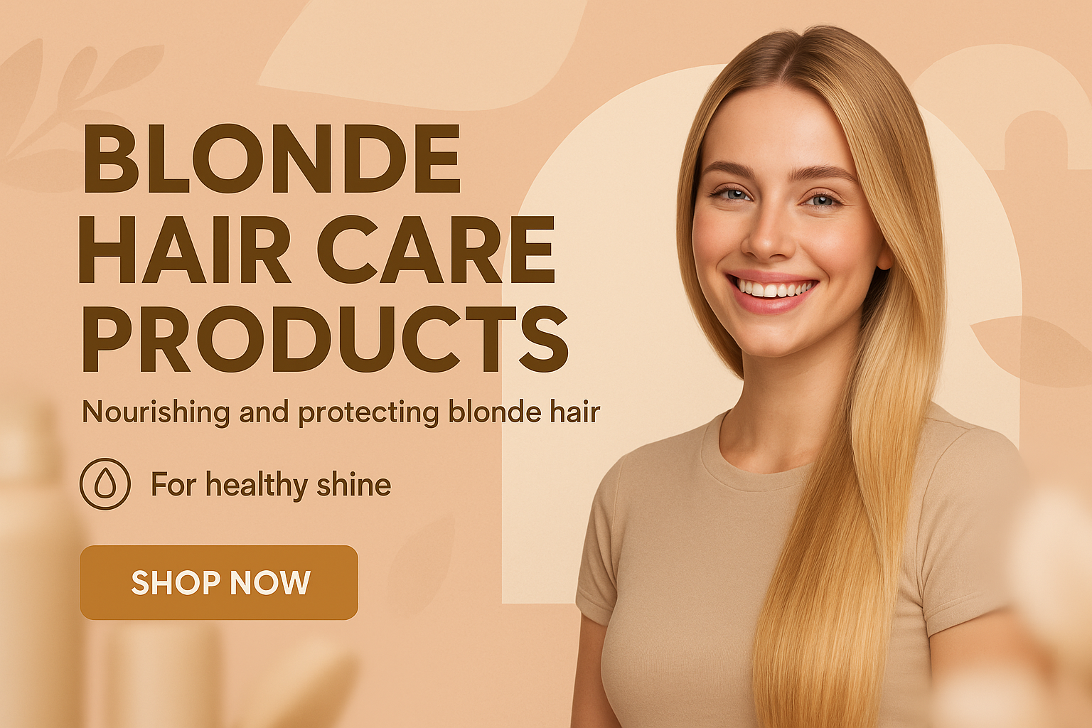 /Collection: /by davooda/Type: PNG/A visually appealing promotional banner showcasing hair care products specifically for blonde hair, featuring a model with long blonde hair against a soft, warm background. Ideal for beauty and personal care marketing.