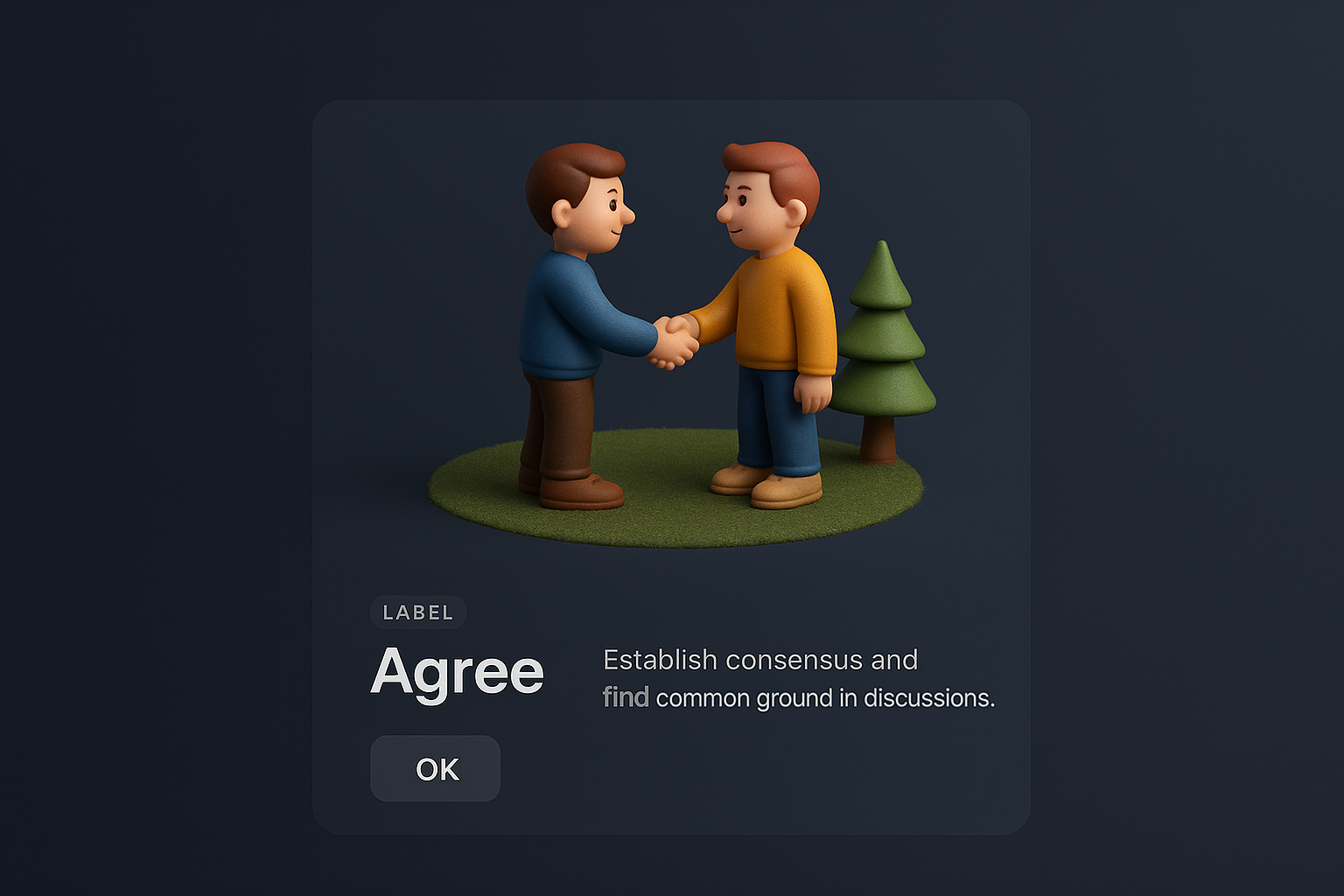 A zoomed-out 3D scene depicting two characters shaking hands, symbolizing agreement. The background features a dark gradient, enhancing the scene's focus.