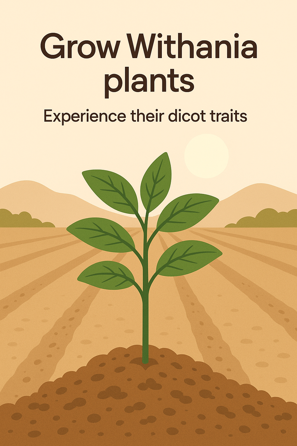 A vibrant illustration showcasing a Withania plant sprouting from soil, set against a background of rolling hills and a sunrise. Ideal for educational content on botany or gardening.