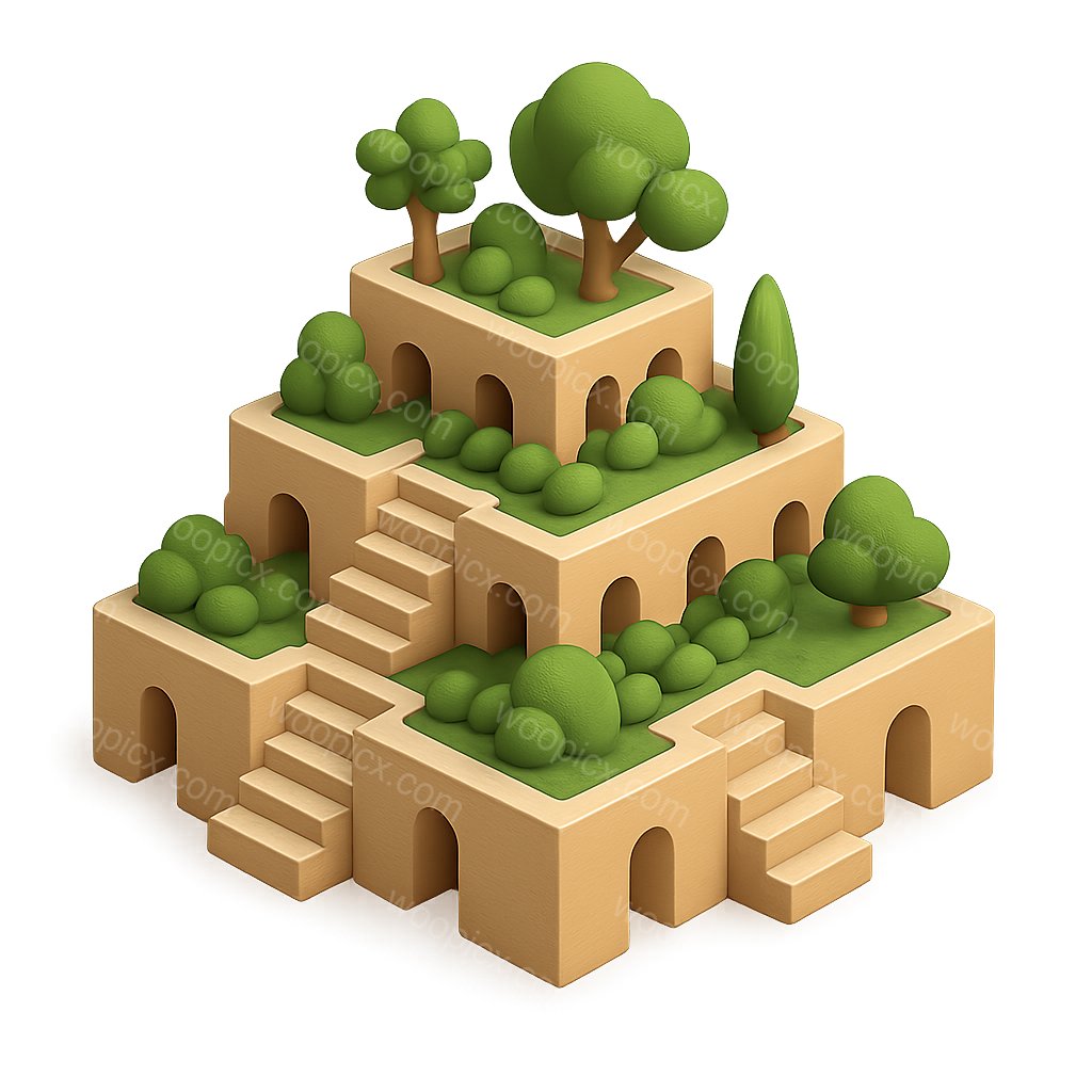 /Premium/Collection: /by davooda/Type: PNG/A stylized 3D representation of the Babylonian Hanging Gardens, featuring tiered terraces, lush greenery, and trees, designed with an isometric perspective and a transparent background.