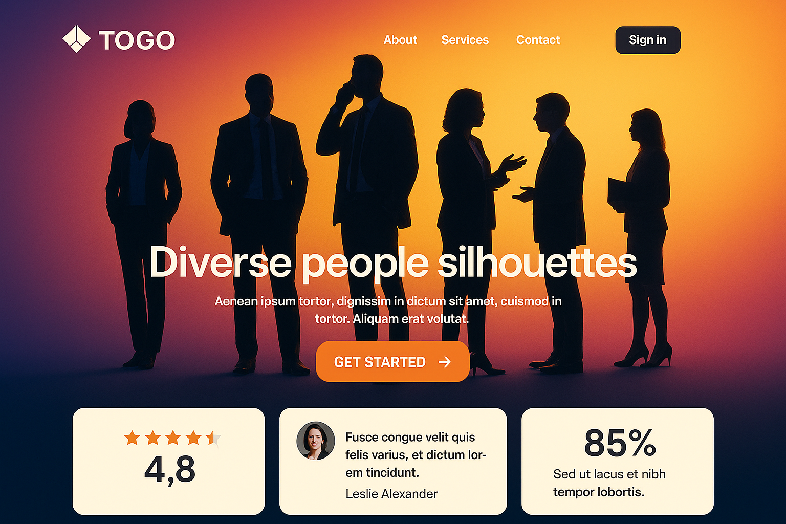 /Collection: /by davooda/Type: PNG/A modern landing page featuring silhouettes of diverse professionals in business attire. The design includes a vibrant background, engaging typography, and action buttons.